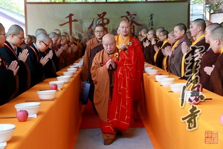 千僧斋,顾名思义,即同时布施一千名僧人之意。其起源应该始于目犍连尊者盂兰救母,供养十方结夏僧众。僧为三宝之一,是佛法的传播者,道由人弘,僧宝在即佛法在,因此供养僧人是大福德大功德的事。而且“凡是供千僧大斋之时,必定有一位罗汉降临应供”,不过罗汉来应供,大多是现比丘相,混杂在大众僧人之中,凡眼不能识得罢了,所以是无比殊胜的。