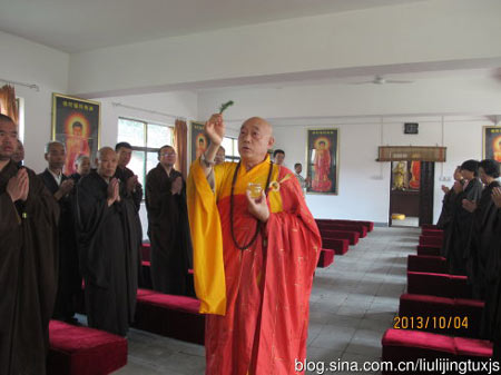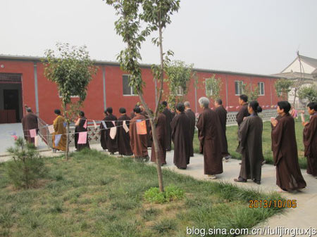 2013年10月5日当日下午2点,净土祖庭陕西长安香积寺2013年度首次十日百万佛号闭关活动举行入关仪轨,来自西安周边及省内外各地的三十余名净业行人在香积寺监院、本次闭关中担任监香师的觉尊法师带领下,共同诵念“香积寺十日百万佛号闭关誓愿文”后,在庄严的在佛号声中各自走进关房,开始了为期十天的闭关念佛活动。