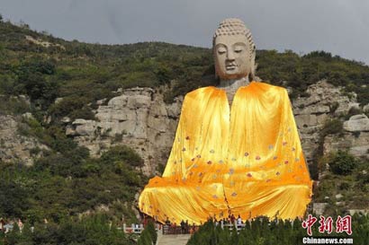 山西太原蒙山大佛被披上了一件重约800斤的僧袍(图片来源:中新社发 摄影:韦亮)