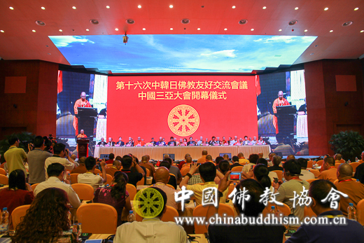 开幕式由中国佛教代表团首席代表、中国佛教协会副会长学诚法师主持。在三国佛教代表的庄严诵经声中,第十六次中韩日佛教友好交流会议正式拉开帷幕。开幕式上,国家宗教事务局王作安局长作重要讲话、海南省何西庆副省长致欢迎辞。其后,中国佛教代表团团长、中国佛教协会会长传印长老,中国佛教协会副会长班禅额尔德尼•确吉杰布,韩国佛教代表团团长、韩国佛教宗团协议会会长慈乘长老,日本佛教代表团团长、日中韩国际佛教交流协议会副理事长安田暎胤长老分别致辞。