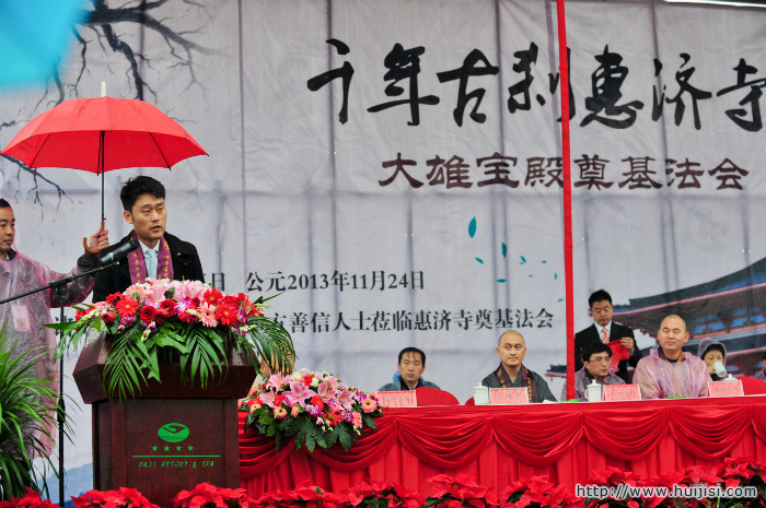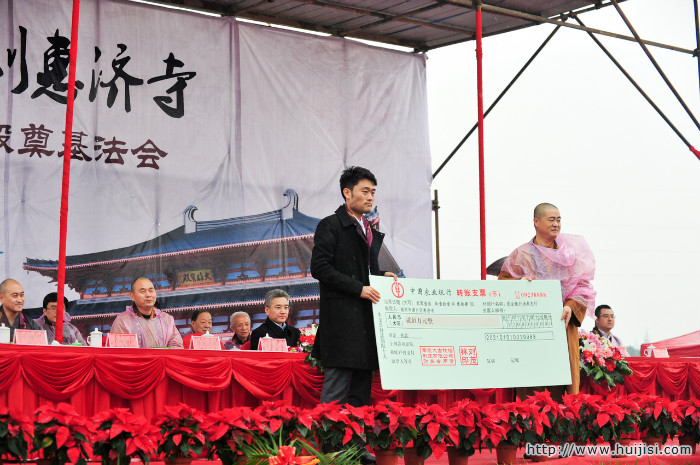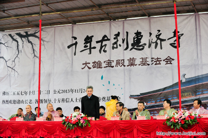 2013年11月24日上午十时,善信云集,江苏省南京市古惠济寺大雄宝殿奠基典礼隆重举行。 南京古惠济寺大雄宝殿奠基典礼由南京电视台著名主持人韩永联主持,参加典礼的贵宾有:江苏省宗教事务局宗教处副处长鲍蜀生,南京市宗教事务局副局长宗志清,南京市口岸办海陆空港处处长刘杰,南京市浦口区政府副区长陆一,南京市浦口区政协副主席、区委统战部部长金仁斌,南京市浦口区委统战部副部长、区民族宗教事务局局长李学贵,南京市浦口区汤泉街道党工委书记韩忠,南京市浦口区汤泉街道办事处主任黄文,南京市佛教协会常务副会长马荣恩先生,南京市佛教协会副会长刘大任居士,国内著名佛教学者、南京大学宗教学系杨维中教授,虚云老和尚关门弟子、国内禅宗大德、安徽含山褒禅寺方丈 绍云大和尚,江苏省佛教协会副会长大初法师,江苏省佛教协会副会长、南京市佛教协会会长、栖霞寺方丈 隆相大和尚,南京市佛教协会副秘书长、鸡鸣寺监院永定法师;苏宁环球集团张康黎总经理,南京金陵饭店孙玉总经理,南京大吉集团刘茂林董事长,南京大吉集团刘屹副董事长,南京天霖教育集团何淼博士,南京市浦口区珍珠泉索道有限公司谢海滨总经理,南京江标集团有限责任公司张晨总经理,南京江标铁塔制造有限公司任久荣总经理等;以及千余名护法善信参加奠基仪式。