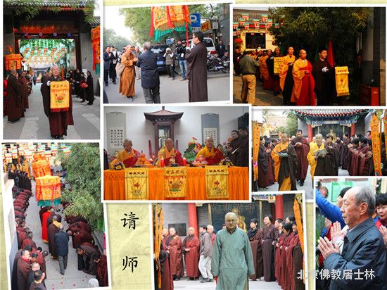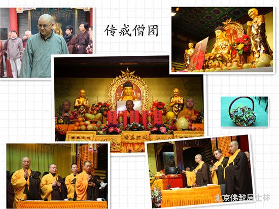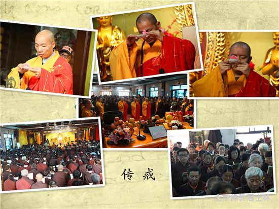 2013年10月27日,由整齐肃穆的仪仗队引路,迎请戒和尚代座释觉灯律师,羯摩师释容通法师,教授师释法广法师三师入殿登法台,为受戒弟子传授梵网经菩萨戒。戒场香桂缭绕,旖旎飘摇,庄严肃穆,得戒戒弟子如沐佛光,欢喜甚哉!