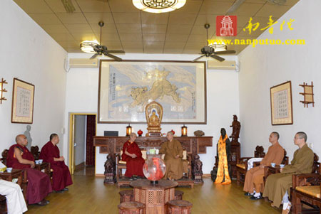 2013年11月20日,青海省政协副主席、塔尔寺管委会主任宗康活佛一行三人到访厦门南普陀寺。厦门市佛教协会会长、南普陀寺方丈则悟法师在方丈楼热情接待了宗康活佛一行。陪同接待的还有:南普陀寺知客戒舟法师、知客兼衣钵弘来法师。