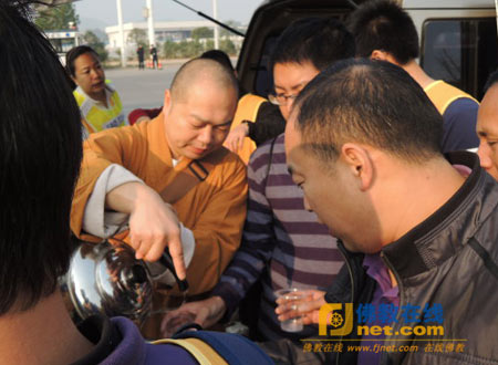 为了此次行脚活动能够圆满进行,洗心义工组的后勤保障做得非常贴心。由于路途较远,考虑到大家上卫生间的需要,义工组提前派专人探询路况,一路上及时为大家上卫生间做好提示,解除了大家的后顾之忧。并全程负责安保、医疗保障。正当走到精疲力竭时,寺院为大家送来了热气腾腾的红糖姜茶,缓解了的疲劳,补充了新的能量;据悉这美味的红糖姜茶是老义工杨冬云精心熬制的。