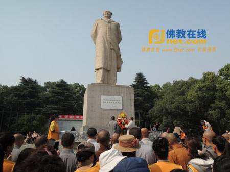 队伍沿普瑞大道一直走到湘江边,然后沿潇湘大道行进,不到11点,就已到达湖大牌楼。午餐后,行脚人员在湖大东方红广场毛主席铜像前集合,道圆法师、海德法师向毛主席铜像敬献花篮,大家在庄严的国歌声里,缅怀伟人,激励自己,奋发向上,报效祖国。
