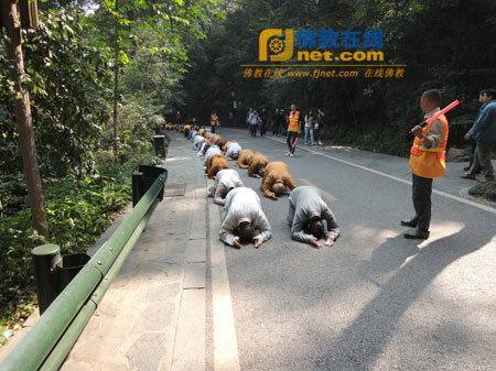 而后,行脚人员依然保持队形,以三步一拜的形式,从岳麓山下开始一路朝拜直至麓山寺。周围游客纷纷驻足,赞叹。