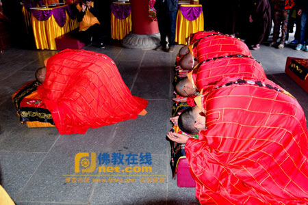 在庄严的梵音中,妙华法师拈香升座,法脉弟子悟圣法师、悟博法师、能度法师、惟正法师、来绘法师、常妙法师拈香、展具、礼拜、长跪合掌,聆听妙华法师宣说法语。