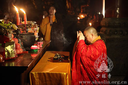 凌晨五点半,少林寺僧众在方丈永信法师的带领下,在大雄宝殿上早殿、诵经祈福。随后,大家迎着阵阵寒意前往塔林,依次在各座祖师塔下诵经上供,并焚烧五色纸,以祭奠历代祖师大德。