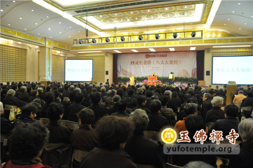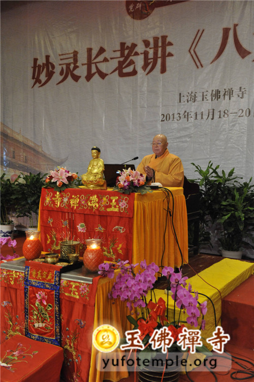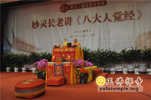2013年11月18日,是上海玉佛禅寺第十二届“觉群文化周”的第四天,上海市佛教协会名誉会长、上海佛学院名誉院长、真如寺退居方丈妙灵长老为信众在玉佛寺觉群楼多功能厅宣讲《八大人觉经》。妙灵长老今年85岁,年少出家,兼学大小乘三藏,长期从事教育教学工作,是当代佛门德高望重的高僧,他的学生遍布上海各大寺院,近年来,长老四处弘法,讲经传道,诲人不倦。