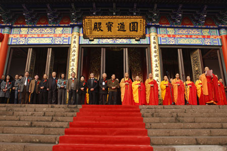 原中国人民解放军总装备部副政委葛焕标先生,绍兴市老领导、市书法家协会主席袁长寿先生,绍兴市委统战部副部长、市民宗局局长黄文刚先生,浙江省佛教协会会长怡藏法师,省佛教协会副秘书长、市佛教协会会长净芳法师,市佛教协会副会长、柯桥区佛教协会会长法弘法师等应邀出席,中央、省、市、区(县)、镇有关部门(单位)领导,诸山长老、书法界知名人士和来自各地的佛教信众数百人莅典,盛况空前。
