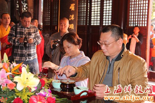 在大雄宝殿,梦参长老佛前上香,然后登临法座。照诚大和尚率领龙华古寺两序大众、四众弟子一起顶礼三拜,给长老接驾。梦参长老心情颇好,精神抖擞,当即为大众说法。他回顾了与龙华古寺前方丈明旸法师深厚的道谊,他说,以前每次到上海都会住在龙华古寺,与龙华有深厚的缘分,还曾和明旸法师一起去美国弘法,参加万佛城水陆法会,传戒法会等。他勉励大家学习明旸法师为法忘躯的菩萨精神,莫忘众生苦,誓愿成菩提。