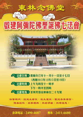 香港东林念佛堂将于2013年12月13日启建阿弥陀佛圣诞佛七法会。