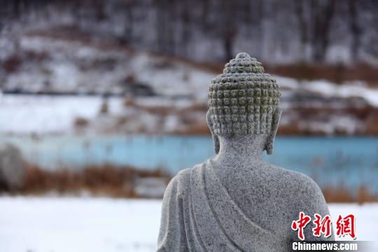 加拿大五台山的灵泉湖和湖边的佛像