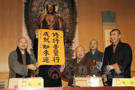 中国佛教协会会长、中国佛学院院长传印长老向赠款单位回赠纪念品