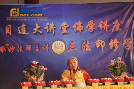 2013年12月24日,湖北黄石大冶目连寺目连大讲堂举办弘法讲座,山西代县白人岩寺住持廓妙法师受邀主讲。为期两个小时的讲座中,廓妙法师以“三法印修学”为主题作了精彩开示。法师从什么是三法印、三法印对大众修学的意义、及怎么修学三法印三个角度为居士信众作了详细阐述。