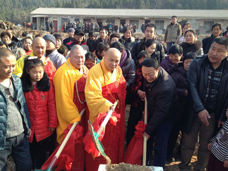 庆典仪式过后,薛亚军、果光法师、合愿法师、心同法师等为白云寺天王殿填土奠基。