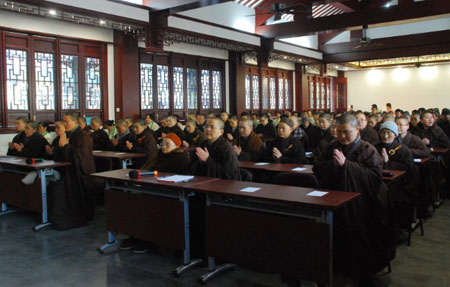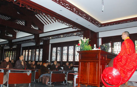 法师依文解义,讲解《三宝歌》的内容,对“大悲大智大雄力”的觉悟者——佛陀大加赞叹,讲述“佛”智慧光明照耀一切,用大慈悲来衽席群生,使众生得到平安;讲述“法”的世界观——“二谛总持”与实践论——“三学增上”,并盛赞太虚大师所撰歌词——“众缘性空唯识现”将三藏精义浓缩其中;赞叹僧团功德,正如佛如医王、法如良药,僧正如照顾众生的护士,维持正法住世不灭。讲到“焰续佛灯明”时,法师鼓励出家众承佛遗教,弘法利世,并以《维摩诘经》“无尽灯法门”为依据,以自己的新浪微博(@无尽灯楼)与网络“无尽传灯微博共修”为例,鼓励大众方便善巧,接引众生诵经、抄经、念修、修动中禅等,种下学佛善因。