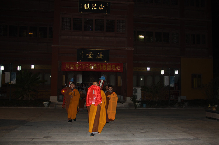 晚饭后,本次七期洒净仪式正式开始,同觉寺方丈曙提法师带领大家逐一遍洒甘露法水,清净坛场。稍息后,大家在禅堂起七,起七开始,奉和尚命恭请数位法师分別担任本次七期执事,以护持大众,圆满七期。随后,曙提法师开示耳根圆通法要及本次圆通七缘起。法师结合自身修学的体会,详细教习了耳根圆通修法的要点,大众听后,信心倍增,法喜充满。
