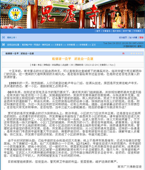 2013年岁末,正逢西方传统的“平安夜”,白胡子的圣诞老人到处走动,圣诞的灯火绚丽多彩,不管是否信教,很多人都互道平安。不过,南京毗卢寺的僧众和广大信众怕是和“平安”无缘了。2013年12月23日夜里,南京毗卢寺院墙遭到南京玄武区城管暴力强拆,引起了南京毗卢寺僧众和信众的强烈反感。