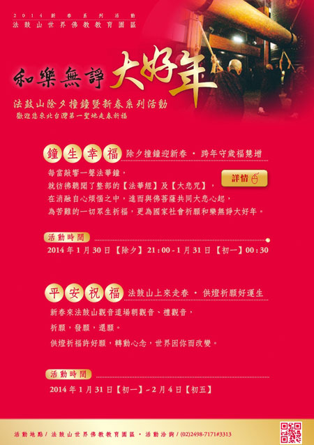 2014年1月30日(除夕),台湾法鼓山将举行除夕撞钟暨新春系列活动。