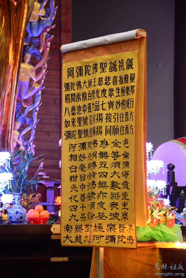 每年的农历十一月十七日,是全球净业行人共同期待的“父亲节”,是我们日夜称念的“南无阿弥陀佛”这句万德洪名的本尊——西方极乐世界教主,我们的慈父阿弥陀佛的圣诞日。为庆祝这一重要的节日,2013年12月18日晚,东林寺净土苑在以阿弥陀佛为主佛像的念佛堂,举行了隆重的阿弥陀佛祝圣法会。