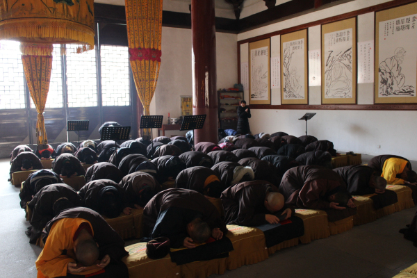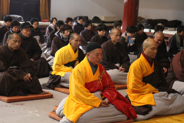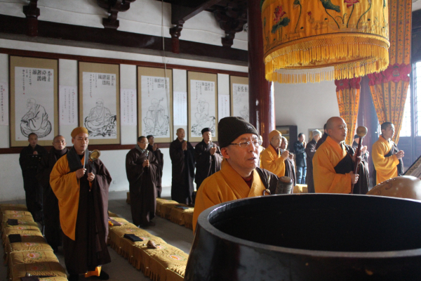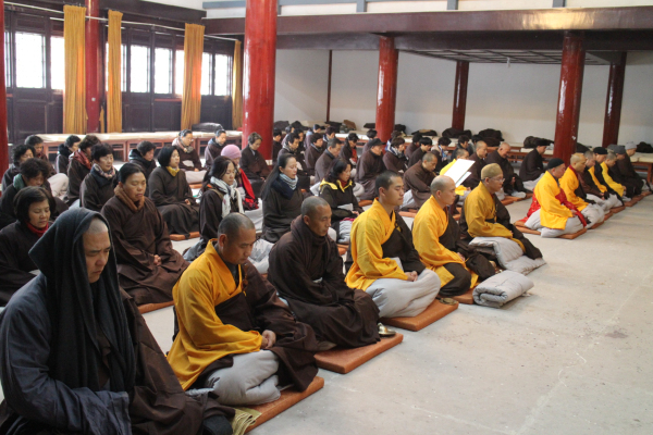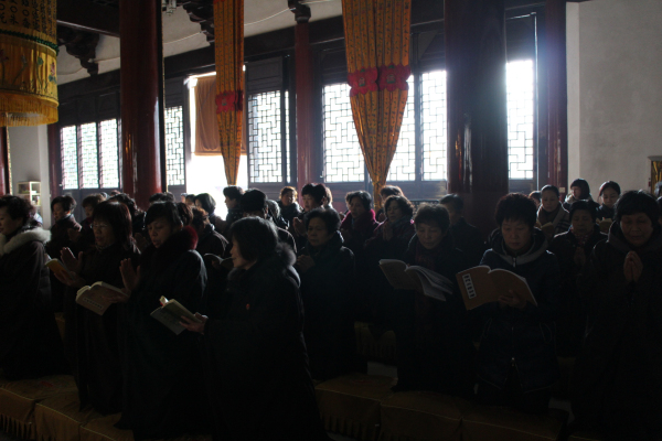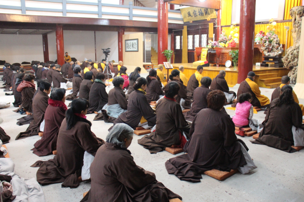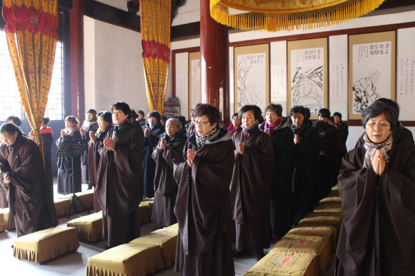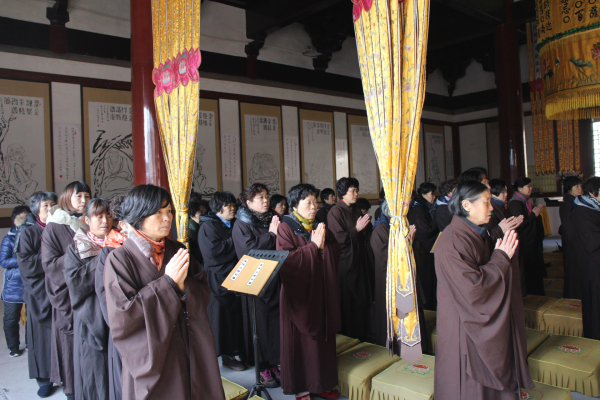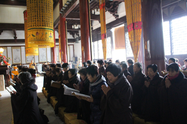 2013年12月19日(农历11月17)是阿弥陀佛圣诞的节日,能仁寺的弥陀佛七法会在今天下午圆满解七。弥陀佛七法会期间每天安排八支香,了法大和尚在每天的第二支香时间,给大众开讲《佛说阿弥陀经》。寺院内除了早晚二堂的功课之外,其余的时间是安排念阿弥陀佛的圣号和静坐。今天上午8点30分寺内举行祝圣祈福普佛,下午2点举行超荐普佛,佛教的四众善信一百多人参加了殊胜的法会,大家都法喜充满。