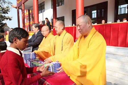 最后,中华寺慈善捐赠仪式由学诚法师与印顺法师为代表,向当地希望小学及慈善医院进行捐赠,分别为学生派发文具和为困难户派米。