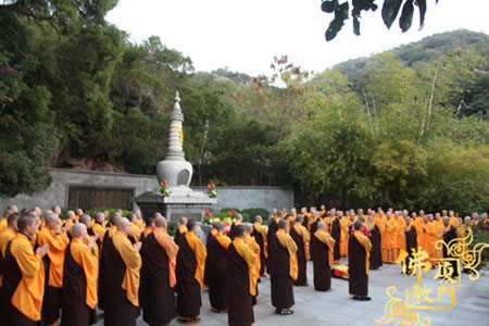 则悟法师带领全寺僧众、闽南佛学院师生在妙湛长老塔前举行隆重的诵经仪式