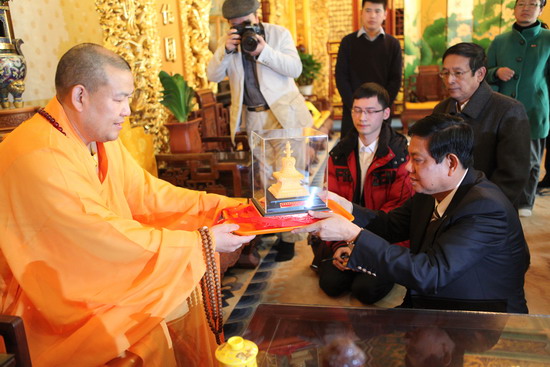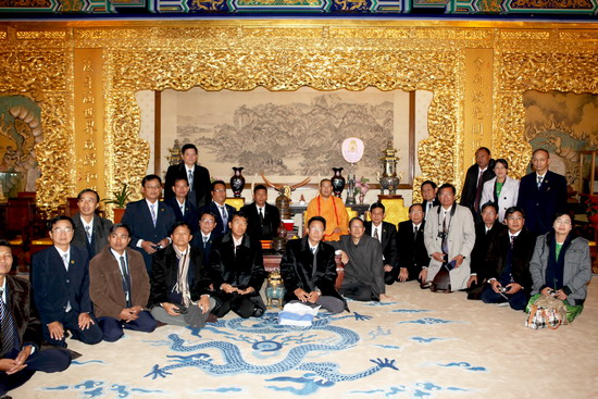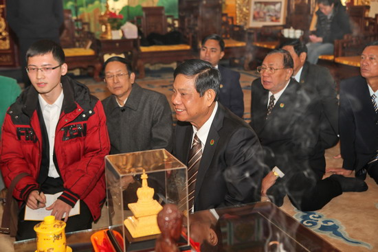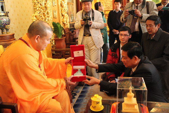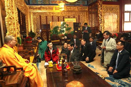 2013年12月7日缅甸巩固和发展党副主席吴泰吴一行30人前来灵光寺参拜佛牙舍利,本寺方丈常藏大和尚热情接待代表团一行.