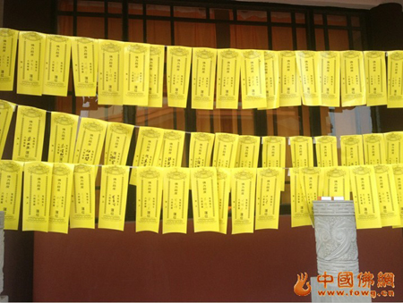 参会的亡者亲属在法会现场挂起祈福牌