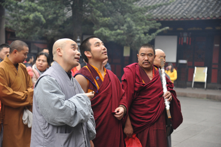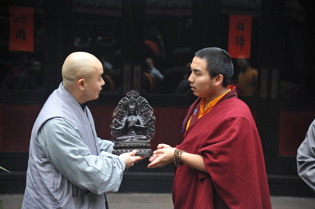 2013年12月21日下午,扎西格培寺第三世琼布活佛一行参访成都文殊院,受到了文殊院方丈宗性法师的亲切接待。