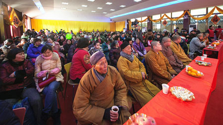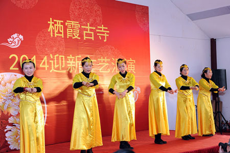 近日,江苏省南京栖霞古寺隆重举办的“2014年栖霞古寺年会”在佛学院大礼堂拉开序幕,现场暖意融融,座无虚席,三百多名信众现场欣赏节目。