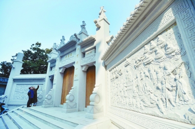 来自福建泉州的工匠介绍,毗卢寺新山门上的雕刻全为手工精心制作,经当地百名工人耗时10个月完成。