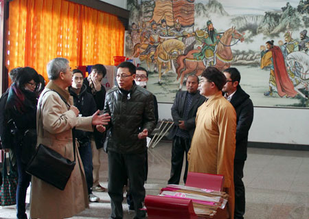 在伽蓝殿内,智雨法师向大家介绍了伽蓝菩萨成为佛教护法的历史,代表团成员被壁画中描述的精彩故事所吸引,对于汉传佛教博大的文化内涵和精美的表现艺术赞叹不已。