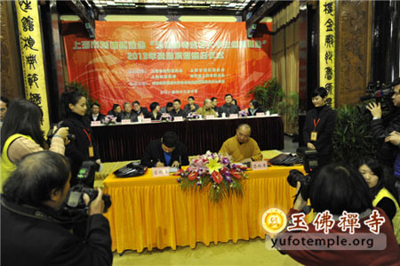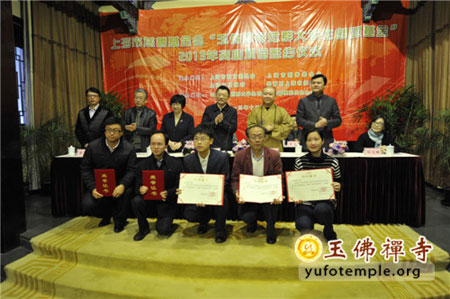 2013年12月10日上午,上海玉佛禅寺举行第二十届“蓝天下的至爱”慈善活动——上海市慈善基金会“玉佛禅寺觉群大学生创业基金”2013年资助项目签约仪式。上海市教委副主任陆靖,共青团上海市委副书记刘刚,上海市民宗委副主任王君力,上海市慈善基金会副理事长姚宗强,上海普陀区委统战部副部长、区民宗办主任张桦等领导和中国佛教协会副会长、上海市佛教协会会长、上海市慈善基金会副理事长、玉佛禅寺方丈觉醒法师,及受资助项目学生代表约60余人参加签约仪式。