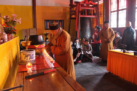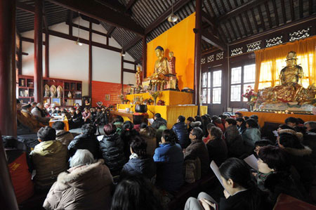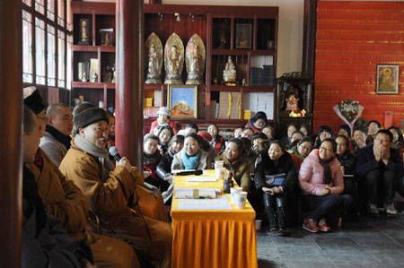 2014年1月19日下午,江苏省南京市清凉寺长期义工八十余人欢聚大殿,参加一年一度道场专为义工举行的普茶。