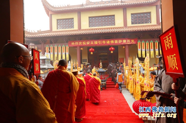 2014年1月26日上午9:30分,南昌市安义县接引寺迎来了大雄宝殿诸佛菩萨像开光法会,来自南昌和省内外的诸山长老和四众弟子数百人参加并见证了这一庄严时刻。