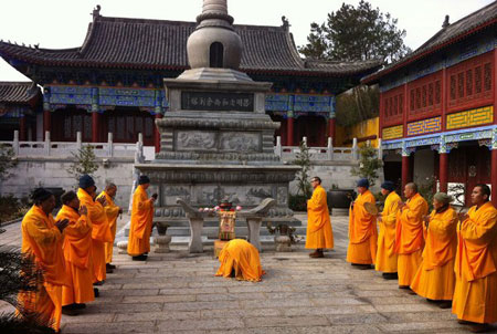 一早,昌明老和尚的真身舍利塔前的香案摆上了香炉,蜡烛等供品,法师们把院子打扫干干净净。上午10时30分,在庄严肃穆的诵经声中,五祖寺首座心慈法师上香行礼叩拜,常住法师们分列两旁齐念般若波罗蜜多心经,三真言等经咒。书禅院内缕缕轻烟,靡靡梵音,寄托了五祖寺众弟子对昌明老和尚的追思。