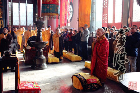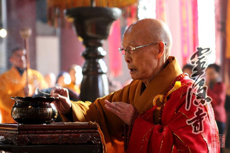 2014年1月1日上午10时,浙江省杭州市灵隐寺举行新年祈福法会,年近九旬的继云长老拈香主法,灵隐寺四众弟子近千人参与了此次祈福法会。