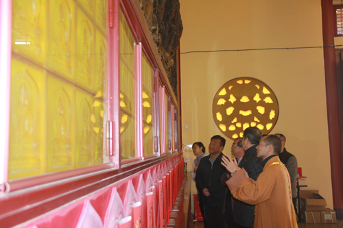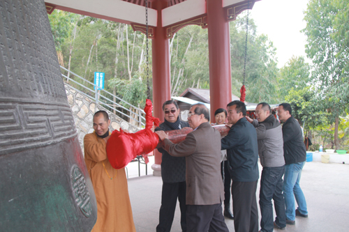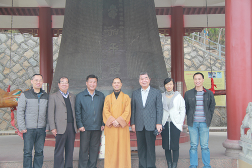 忠明法师引领来宾先后参观了护法殿、大雄宝殿、药师密坛、万福万寿和平钟等寺院重要堂口。随后,在客堂座谈交流。双方就两岸慈善公益事业的发展与运作进行探讨交流。并达成下一步将互派义工不定期的进行志愿服务交流。