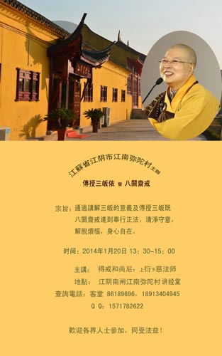 江苏省江阴市江南弥陀村将于2014年1月20日举办三皈依暨八关斋戒法会,届时由得戒和尚尼衍慈法师作主讲。