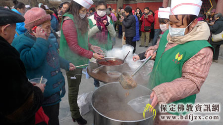 大慈阁的法师和义工们为民众送上腊八粥