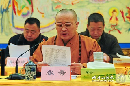 永寿法师致开幕词。他说,过去一年,佛协在党和政府的领导与主管部门的关心支持下,与全山僧众、员工一道,稳步推进各项工作,自养事业和宗教性收入基本稳定,寺院场所清净庄严,和谐安全,取得了良好的成绩。关于佛协去年所取得的主要成绩,他说,佛协根据峨眉山市和峨眉山风景区“同城一体、景城联动”发展方向和总体规划布局,顺势加快了推进金顶二期工程和千佛顶寺院恢复重建的规划建设;调整了大佛禅院的总体规划布局,征地125亩,规划建设峨眉山佛文化中心(金色华藏)项目,发展养生养老的慈善事业,提升佛文化功能;完善大佛禅院西大门,实现峨眉山风景区与大佛禅院佛教文化旅游区的无缝、安全对接,为创建5A级景区奠定基础,为峨眉山佛教的持续发展拓展空间,增强了自养事业的内生动力。关于峨眉山佛教的发展,他说,峨眉山佛教要发展,必须顺应时代发展要求,依托自身优势,创新开拓弘法途径和模式,特别要利用我们的优势,发展养生文化,建设一站式养生度假休闲目的地。最后,他满怀信心期待理事们,“用党的十八大和三中全会的精神武装头脑,指导工作、推动实践。坚定在新的历史起点上推进改革创新的信心和勇气。牢固树立进取意识、机遇意识、责任意识和发展意识,充分认识佛协今后几年所面临的困难,坚持‘勤于学、敏于思’,集贤聚智,不断进取,努力做好新一年的本职本岗位的工作,为峨眉山佛教的每一步发展打好基础。”