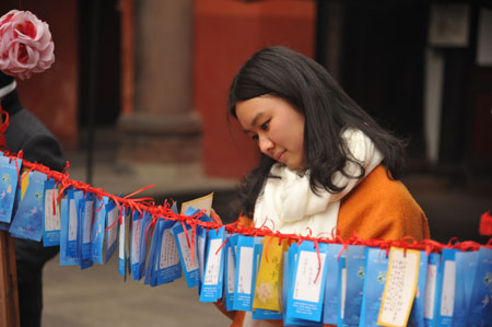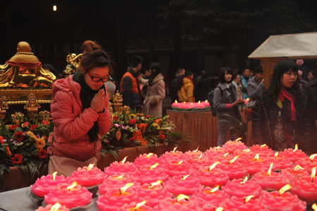 在藏经楼前,数百盏烛灯被信众们亲手点燃。在文殊院里,他们为2014祈福,各种祝福的话语和美好的心愿写满了许愿卡。年轻的朋友和年老的朋友,在文殊院里不分彼此,一起合十,一起礼拜,一起吃斋饭,一起做利益大众的善事,并在新年之际,恭祝善信善友福慧双增,六时吉祥,更祝福祖国和谐昌隆,国泰民安。
