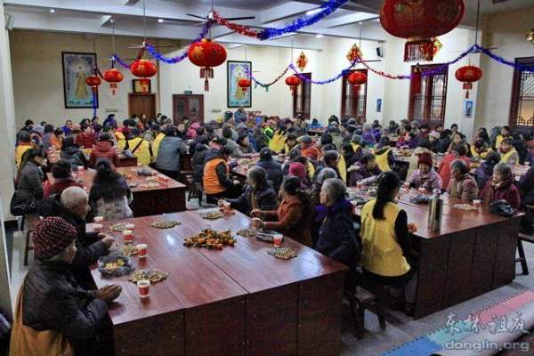 另,2014年1月8日中午,腊八施粥活动结束后,100多位来自九江市、九江县、星子县等地的东林慈护的志愿者们,欢聚在东林寺老五观堂二楼,参加由东林寺慈善护生会举办的新年茶话会。东林寺慈善护生会会长本通法师、副会长德日法师和主管护生的慧悦法师出席了茶话会。