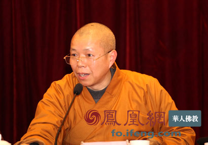 江苏省佛教协会副会长兼秘书长秋爽法师主持会议(图片来源:凤凰网华人佛教)