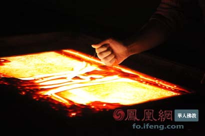 李韬表演沙画艺术“觉悟之光”(图片来源:凤凰网华人佛教 摄影:李保华)