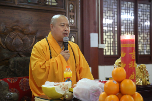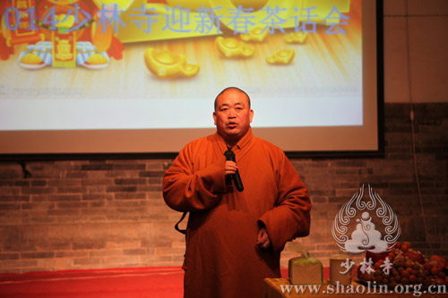 2014年1月29日,农历腊月二十九晚上,少林寺经堂里欢声笑语,一年一度的喜迎新春茶话会在活跃的气氛中拉开序幕。参加茶话会的有:少林寺350多位出家众,少林慈幼院的100多位孩子等。少林寺方丈永信法师现场开示。