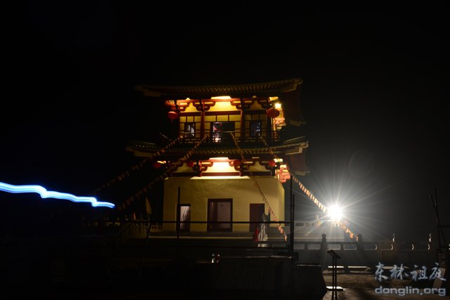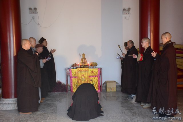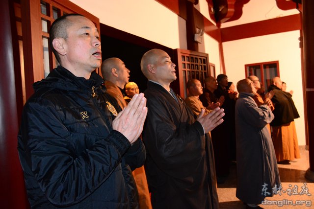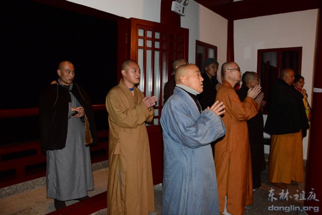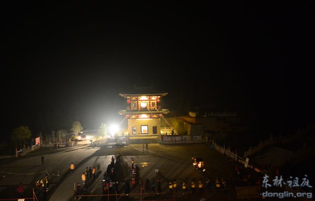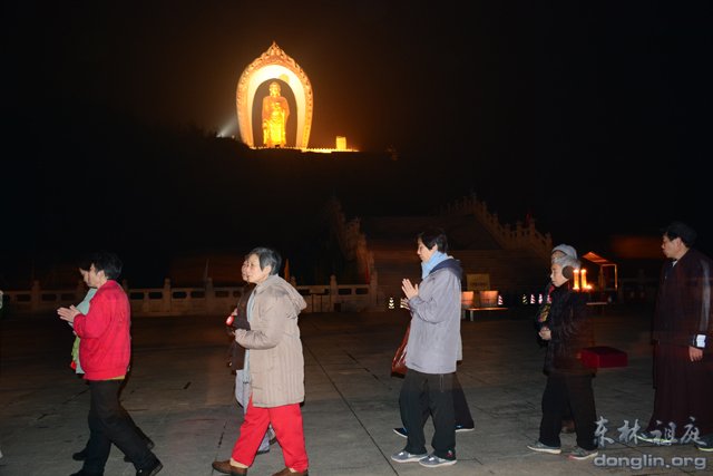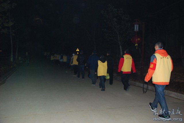 大年三十晚十点多,居士们就在一楼会议室集合。护法团按照一个老年人由一个年轻人负责全程照顾的原则,将六十几位居士分好组,然后大队人马沿中线公路上山,到达拜佛台。在等待师父们到达的时间里,排队在拜佛台经行念佛号。临近午夜,师父们到达。缁白二众沿着又高又陡的楼梯登上钟楼。