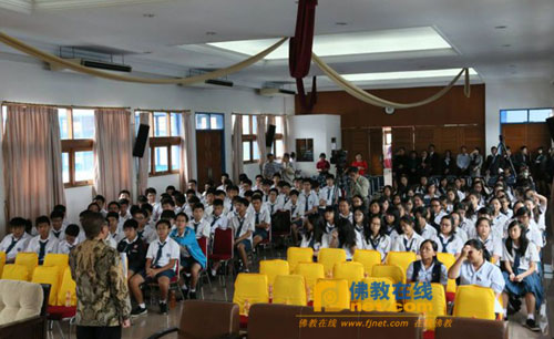 当天上午,在Jakarta permai中学,慈悲的海涛法师、传喜法师为中学师生主讲了题为《“生命工程师”行为反做用力》的佛学心灵讲座,海涛法师讲到,如在佛前、祖先前多点灯自然眼睛会光明,多布施将来会富有,多让父母笑自然就快乐,不骗人口才好,不骂人声音会好听,人是自己制造自己的工程师,所以善有善报,帮助别人才是帮助自己。